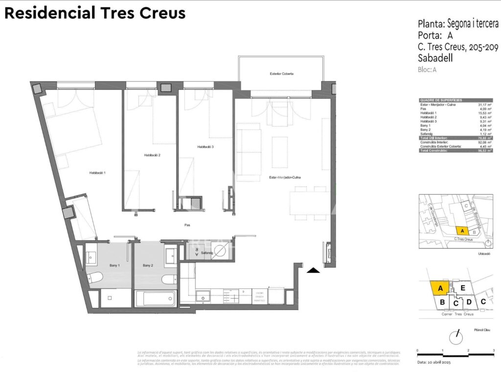 Residencial Tres Creus es una promoción de obra nueva compuesta por dos bloques de edificios que suman 52 viviendas de 2 y 3 dormitorios en el barrio de Covadonga en Sabadell. Su ubicación es céntrica, a menos de 10 minutos del centro de Sabadell, lo que garantiza acceso a una amplia gama de servicios, comercios, y zonas verdes como el Parc del Taulí o el Parc Catalunya. Sabadell también ofrece una excelente conexión con Barcelona (a 30 minutos en tren) y fácil acceso a autopistas como la C-58 y AP-7.