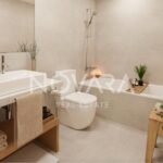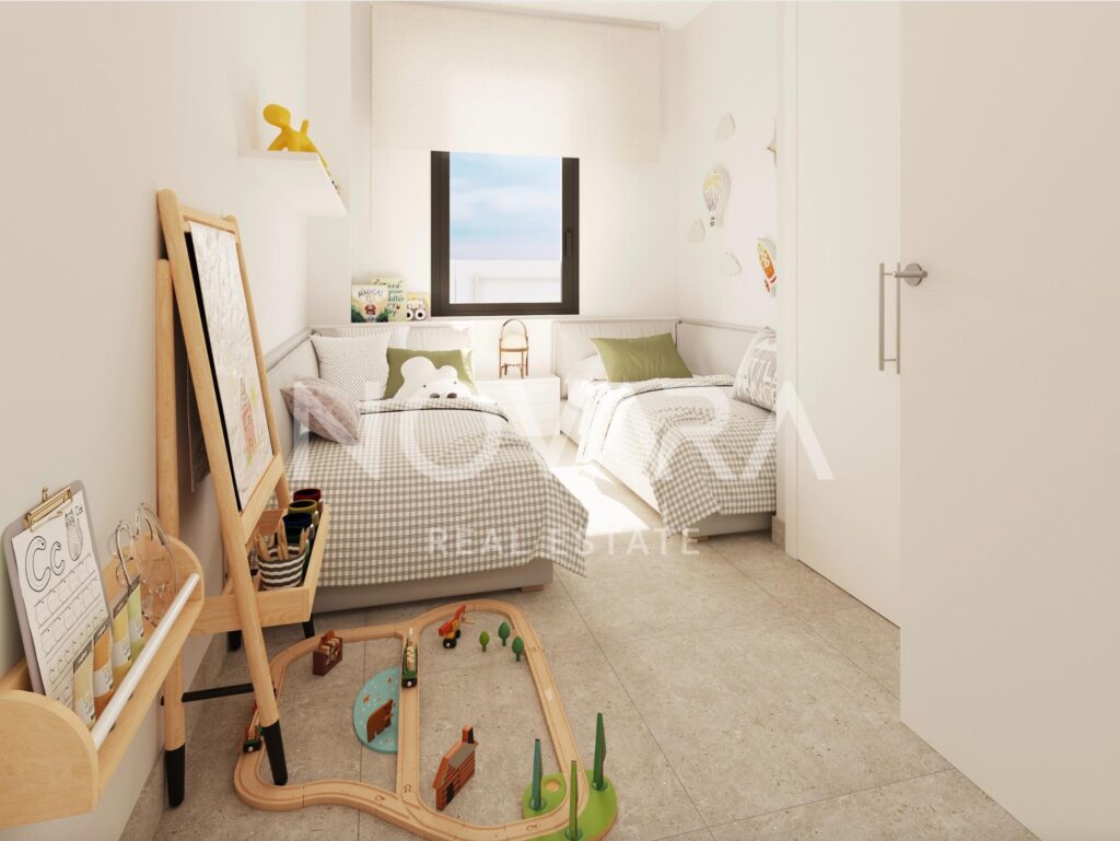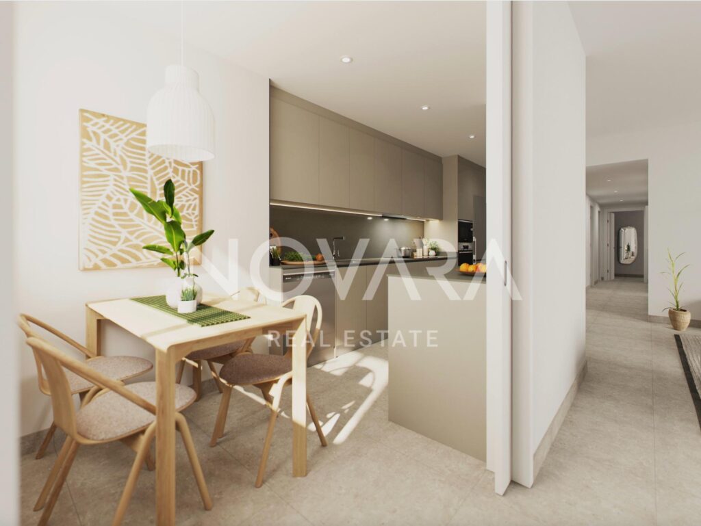 Los interiores destacan por ser amplios, luminosos y con acabados de calidad. Los pavimentos son de gres porcelánico en toda la vivienda. Las cocinas están equipadas con armarios modulares lacados en gris piedra , encimeras de aglomerado de cuarzo tipo Silestone y electrodomésticos Bosch (incluyendo placa de inducción, horno y microondas integrable). Los baños cuentan con sanitarios Roca y grifería Tres.