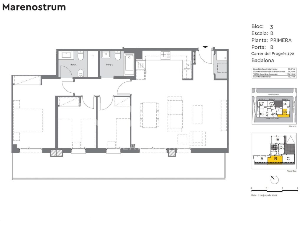 Residencial Marenostrum es una destacada promoción de obra nueva en Badalona. Este gran conjunto residencial se compone de 206 viviendas de 2, 3 y 4 dormitorios, incluyendo también algunas unidades de protección oficial , junto con 7 locales comerciales. Su localización es excepcional, junto al Canal del Puerto de Badalona , ofreciendo a los propietarios espectaculares terrazas privadas con vistas sobre el litoral mediterráneo. Además, goza de una excelente conexión con Barcelona (a solo 3 km) , el Aeropuerto de El Prat , y está próximo al centro de Badalona y a las extensas redes de senderos de la Serralada de Marina.
