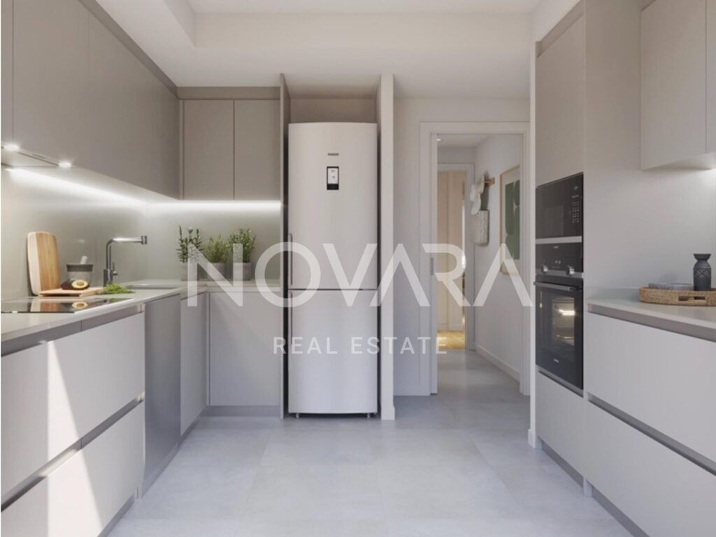 Cocinas: Equipadas con armarios modulares lacados en gris, encimera de aglomerado de cuarzo tipo Silestone Gris Niebla y electrodomésticos Bosch de la serie 6 (placa de inducción, horno pirolítico y microondas).